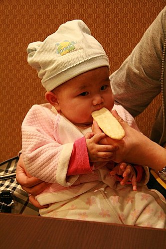 拿餅乾給梅子吃囉,這是你第一次吃餅乾,小心點慢慢吃,等口水濕潤餅乾後再嚥下。